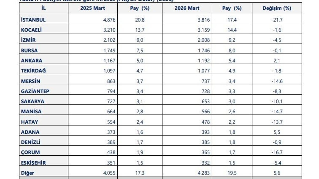 Bakanlık tarafından yapılan açıklamaya göre Mart ayında, İstanbul, Kocaeli, İzmir, Bursa ve Ankara ihracatta ilk beşte yer alan iller olurken, Tekirdağ, Mersin, Gaziantep, Sakarya ve Manisa ikinci beşte yer alan iller oldu. Faaliyet illeri bazında Mart 2026 ihracat sıralamasında 3 milyar 816 milyon dolarla İstanbul ilk sırada yer aldı. Kocaeli 3 milyar 159 milyon dolar ile ikinci, İzmir 2 milyar 8 milyon dolar ile üçüncü, Bursa 1 milyar 746 milyon dolar ile dördüncü, Ankara ise 1 milyar 192 milyon dolar ile beşinci oldu.