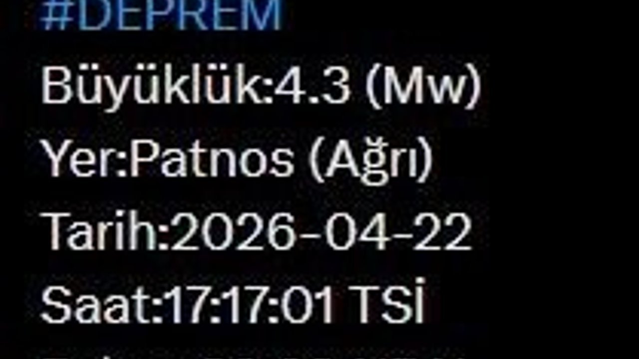 Afet ve Acil Durum Yönetimi Başkanlığı'ndan (AFAD) alınan bilgilere göre, Ağrı'nın Patnos ilçesinde saat 17.17'de 4.3 büyüklüğünde deprem meydana geldi. Merkezi Patnos olan depremin derinliği 13.43 kilometre olarak ölçüldü.