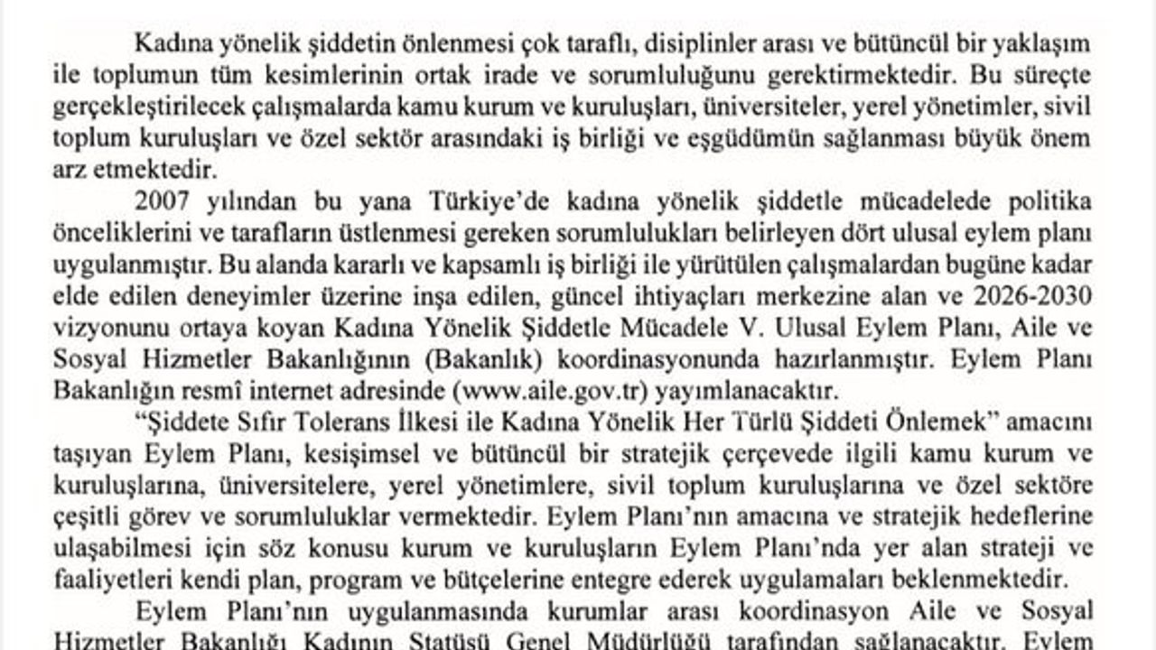 Aile ve Sosyal Hizmetler Bakanı Mahinur Özdemir Göktaş, sosyal medya hesabından yaptığı paylaşımda, '2026-2030 dönemini kapsayan 'Kadına Yönelik Şiddetle Mücadele 5'inci Ulusal Eylem Planımız', Resmi Gazete'de yayımlanarak yürürlüğe girdi. Cumhurbaşkanımız Recep Tayyip Erdoğan'ın ortaya koyduğu 'sıfır tolerans' ilkesini her şeyin üzerinde görüyoruz. Devletimizin tüm kurum ve kuruluşlarıyla kadına yönelik şiddete karşı verdiğimiz mücadeleyi bu Eylem Planı çerçevesinde en üst seviyede sürdüreceğiz. Ülkemiz ve milletimiz için hayırlı olsun' ifadelerini kullandı.