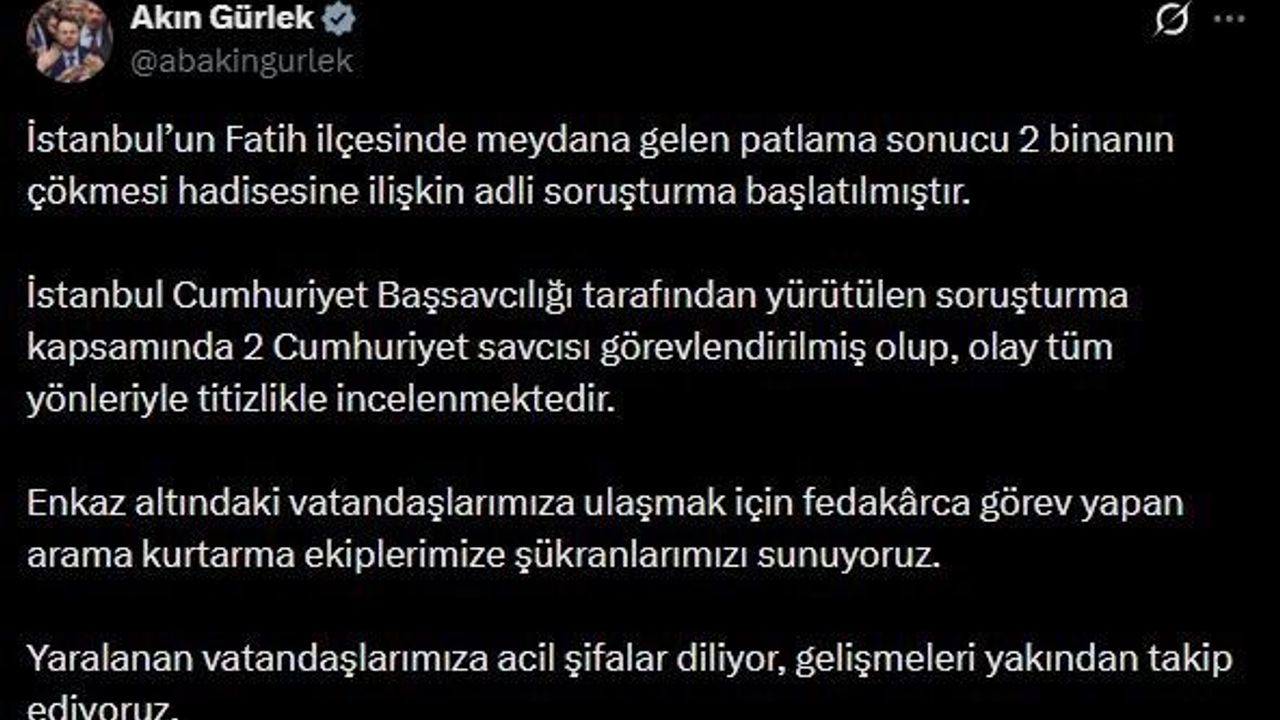 'Meydana gelen patlama sonucu 2 binanın çökmesi hadisesine ilişkin adli soruşturma başlatılmıştır. İstanbul Cumhuriyet Başsavcılığı tarafından yürütülen soruşturma kapsamında 2 Cumhuriyet savcısı görevlendirilmiş olup, olay tüm yönleriyle titizlikle incelenmektedir. Enkaz altındaki vatandaşlarımıza ulaşmak için fedakârca görev yapan arama kurtarma ekiplerimize şükranlarımızı sunuyoruz. Yaralanan vatandaşlarımıza acil şifalar diliyor, gelişmeleri yakından takip ediyoruz.'