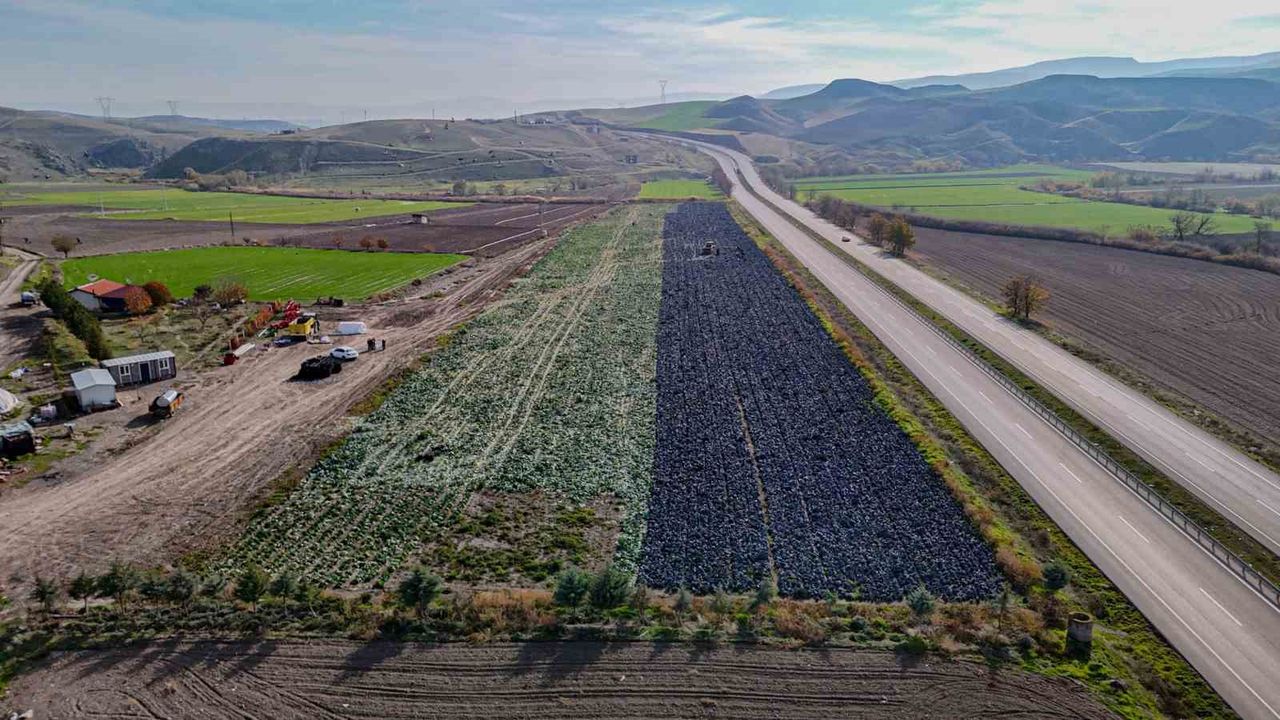 Hasatla birlikte tarlalar mor bir görünüme bürünürken, işçiler gün boyu süren mesaiyle lahanaları tek tek keserek kasalara yerleştiriyor. Beypazarı'ndaki mor lahana tarlaları dronla da görüntülenirken, üreticiler sezonun sonuna yaklaşan hasadı tamamlamak için çalışmalarını aralıksız sürdürüyor.