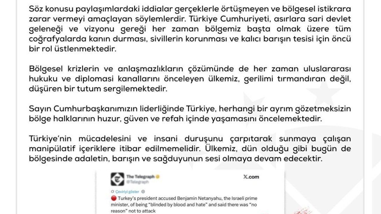 'Bazı medya organları ve sosyal medya paylaşımlarında Cumhurbaşkanımıza atfen yer alan, 'Türkiye'nin İsrail'e yönelik işgal tehdidinde bulunduğu' yönündeki iddialar tamamen asılsızdır. Söz konusu paylaşımlardaki iddialar gerçeklerle örtüşmeyen ve bölgesel istikrara zarar vermeyi amaçlayan söylemlerdir. Türkiye Cumhuriyeti, asırlara sari devlet geleneği ve vizyonu gereği her zaman bölgemiz başta olmak üzere tüm coğrafyalarda kanın durması, sivillerin korunması ve kalıcı barışın tesisi için öncü bir rol üstlenmektedir. Bölgesel krizlerin ve anlaşmazlıkların çözümünde de her zaman uluslararası hukuku ve diplomasi kanallarını önceleyen ülkemiz, gerilimi tırmandıran değil, düşüren bir tutum sergilemektedir. Sayın Cumhurbaşkanımızın liderliğinde Türkiye, herhangi bir ayrım gözetmeksizin bölge halklarının huzur, güven ve refah içinde yaşamasını öncelemektedir. Türkiye'nin mücadelesini ve insani duruşunu çarpıtarak sunmaya çalışan manipülatif içeriklere itibar edilmemelidir.'