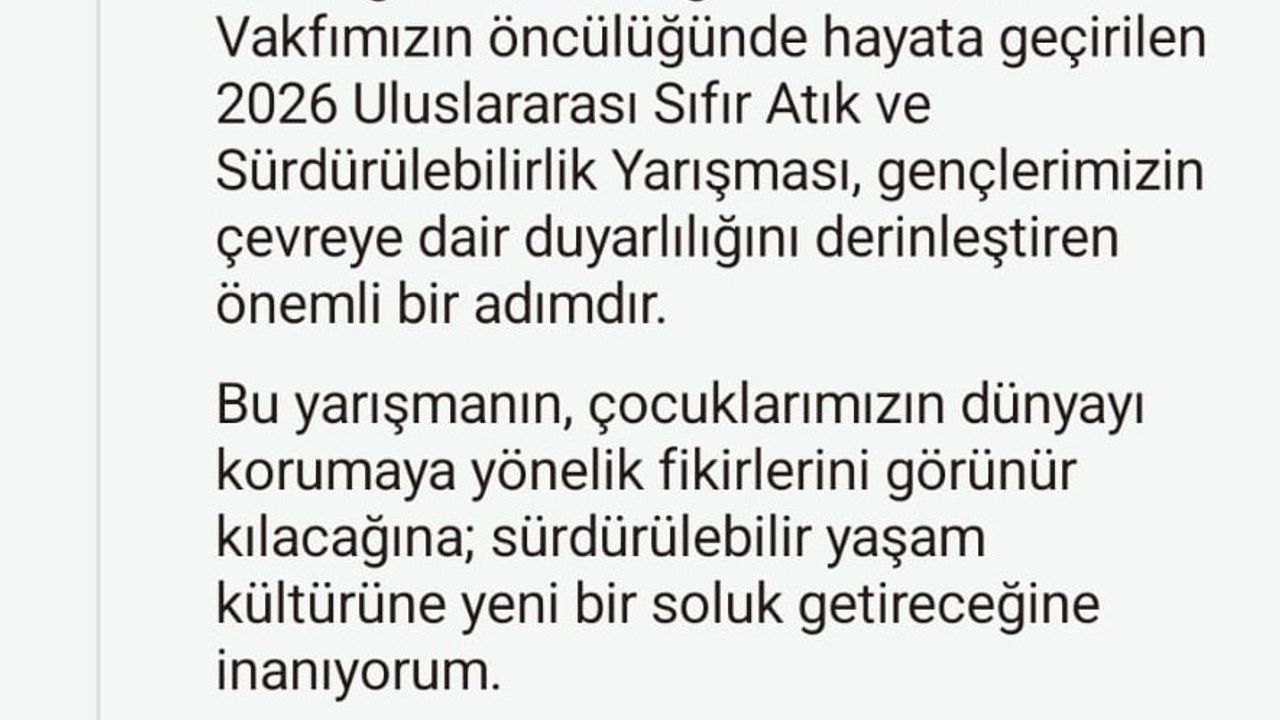 'Milli Eğitim Bakanlığımız ile Sıfır Atık Vakfımızın öncülüğünde hayata geçirilen 2026 Uluslararası Sıfır Atık ve Sürdürülebilirlik Yarışması, gençlerimizin çevreye dair duyarlılığını derinleştiren önemli bir adımdır. Bu yarışmanın, çocuklarımızın dünyayı korumaya yönelik fikirlerini görünür kılacağına; sürdürülebilir yaşam kültürüne yeni bir soluk getireceğine inanıyorum. Emeği geçen herkese teşekkür ediyor, tüm katılımcılara gönülden başarılar diliyorum.'