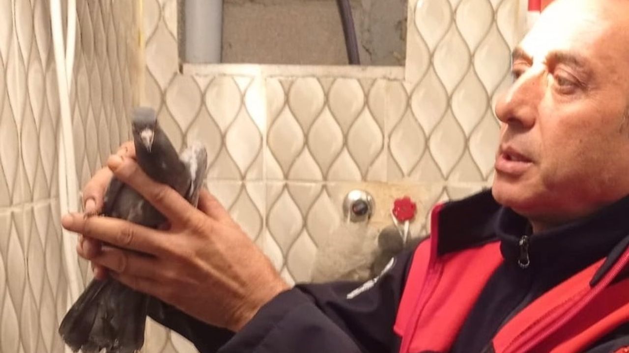Hatay'da bina boşluğunda mahsur kalan güvercini itfaiye ekipleri kurtardı.