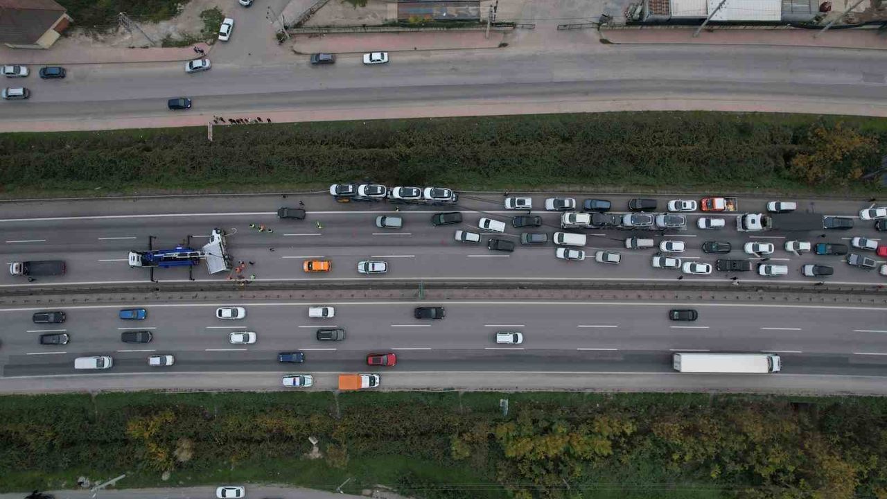 Kazaya ilişkin inceleme başlatılırken, kaza bölgesi ve yolda oluşan araç kuyruğu havadan görüntülendi.